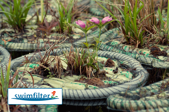 Eine gut durchdachte Bepflanzung sichert effektvolle Blütenpracht die ganze Teichsaison über. Es gilt, Schmuckpflanzen mit Pflanzen mit hoher Filterwirkung zu kombinieren. Als besonders empfehlenswerte Filterpflanzen haben sich u.a. Zwergbinse (Juncus ensifolius), Sumpfsegge (Carex acutiformis) oder der weißbunte Kalmus (Acorus calamus variegatus) herausgestellt. Das erfolgreiche Begrünen der Swimfilter ist mit gärtnerischer Beobachtung und Pflege verbunden. Bereits begrünte Swimfilter sind in mittlerweile fünf Pflanzschulen schweizweit erhältlich. Eine deutsche Pflanzschule ist in Gründung.